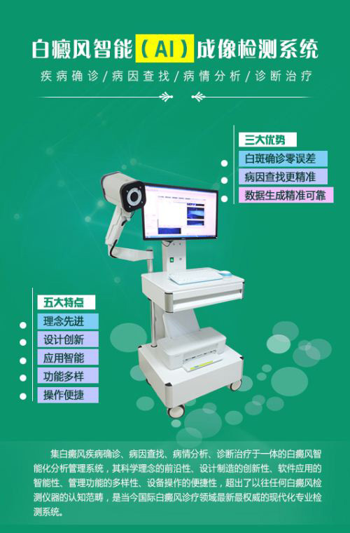 全新白癜风智能(AI)成像检测系统,是一套基于白癜风(白斑)专业检测,集白癜风疾病确诊、病因查找、病情分析、诊断治疗于一体的白癜风智能化分析管理系统,其学科理念的前沿性、设计制造的创新性、软件应用的智能性、管理功能的多样性、设备操作的便捷性,超出了以往任何白癜风检测仪器的认知范畴,是当今国际白癜风诊疗领域较新较权威的现代化专业检测系统。