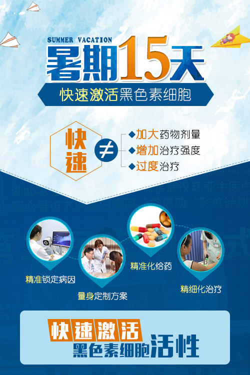 考虑到现实情况,综合各方面考量,经我院领导研究一致决定,将活动延期至25日!希望广大家长抓住开学前的较后时间,带着孩子做专业治疗。通过暑期强化门诊治疗,15天快速激活黑色素细胞活性,逐渐恢复正常肤色。